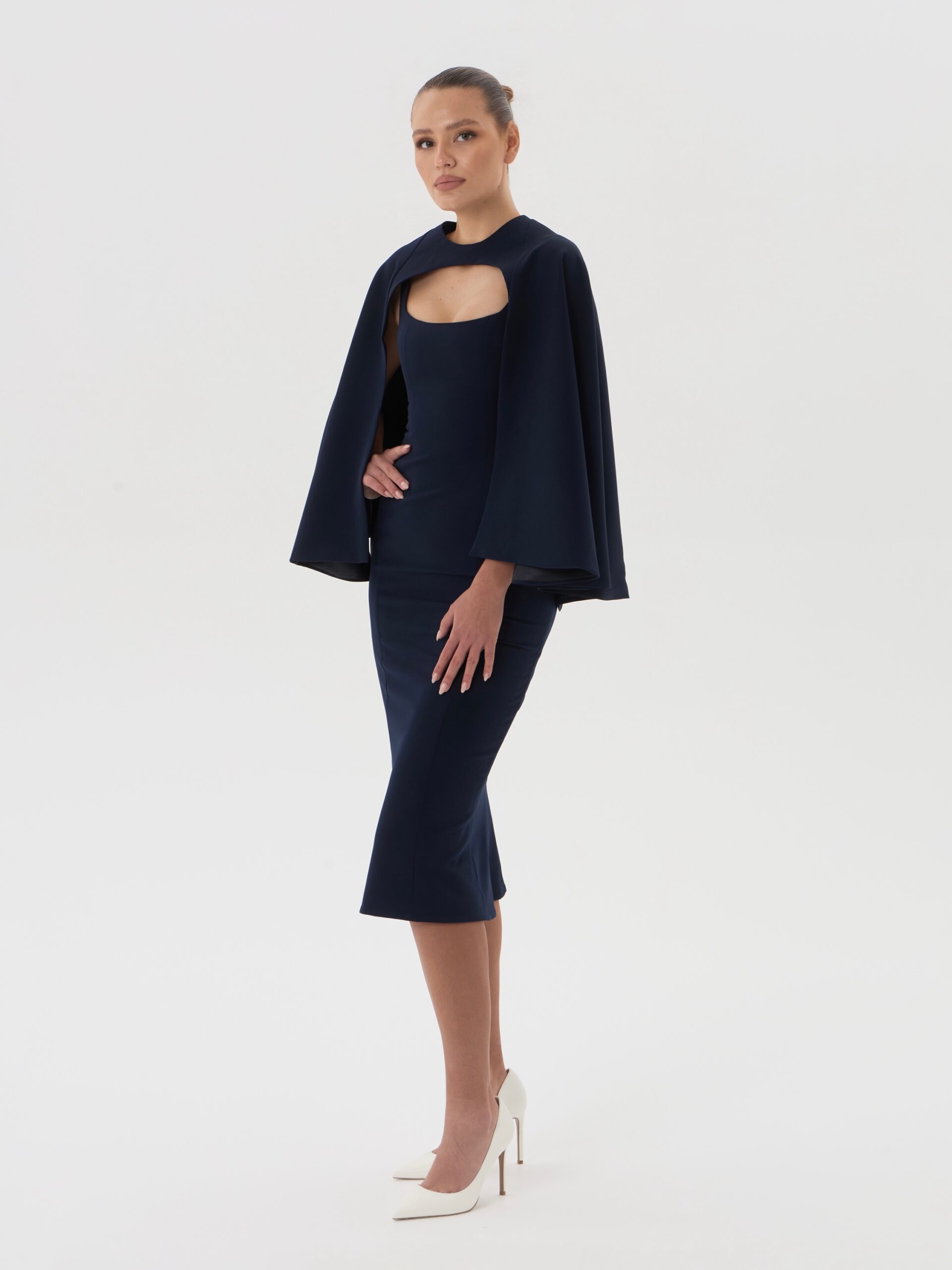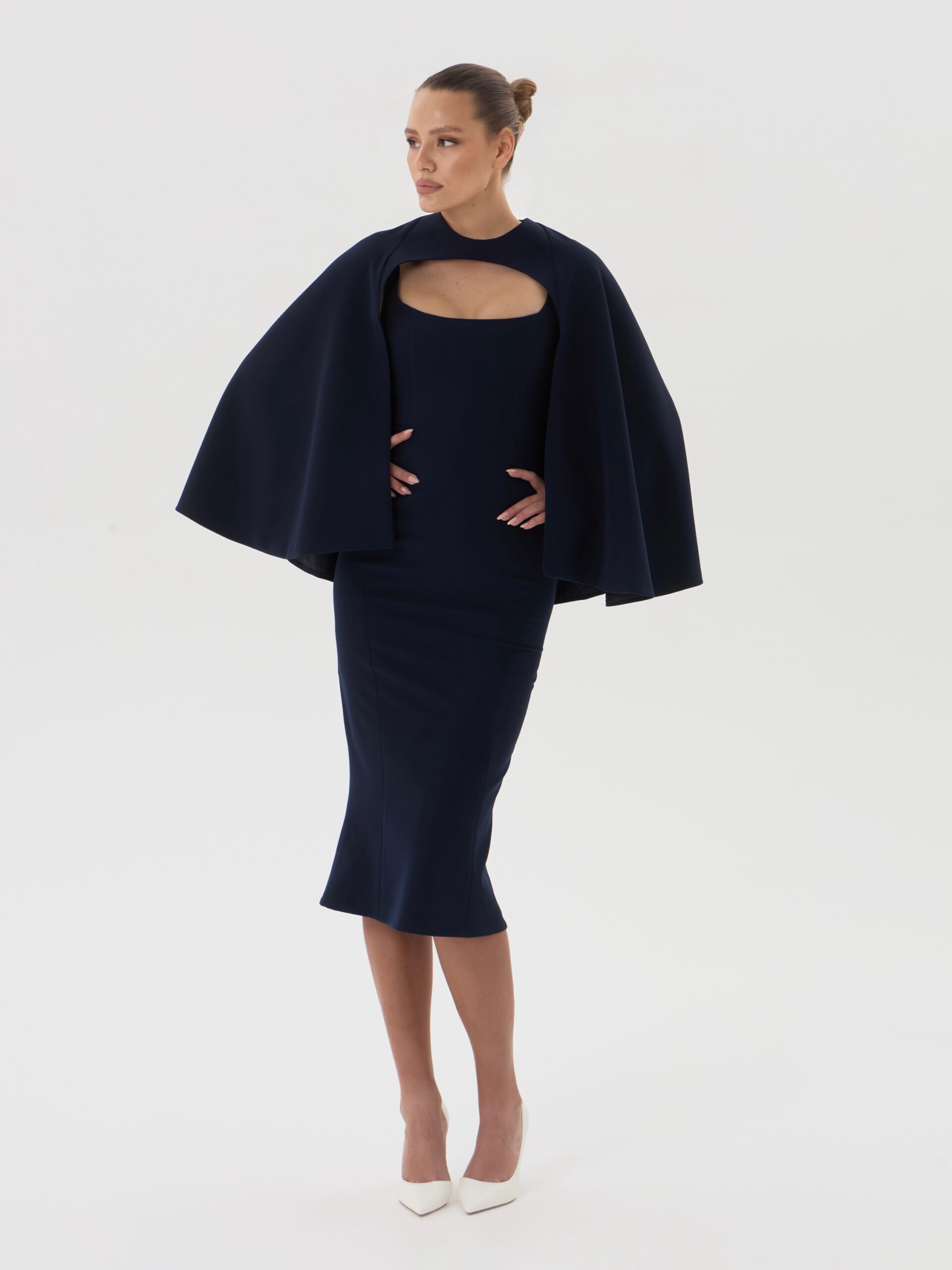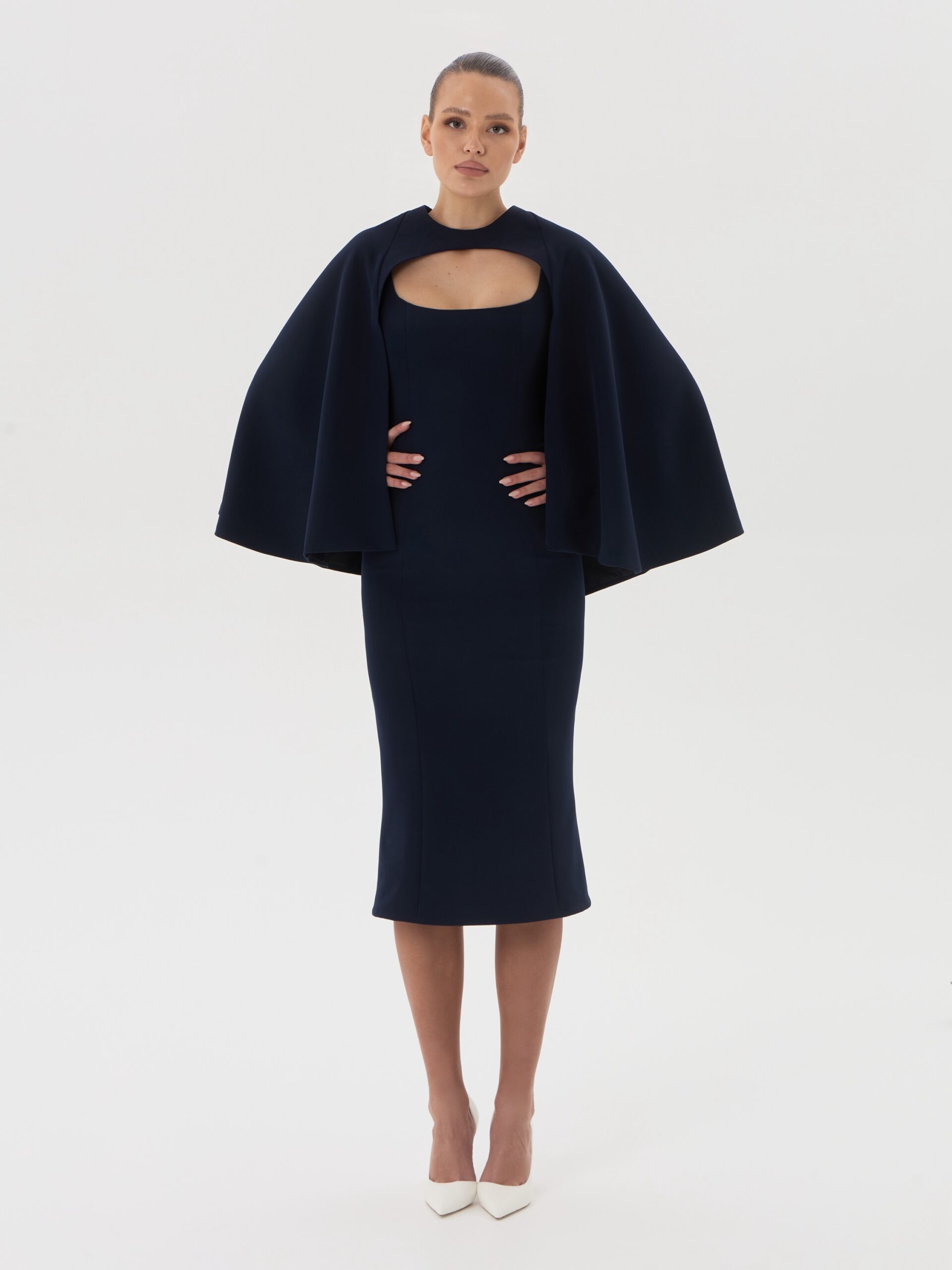 Приталенное платье миди с лаконичным вырезом и съёмной накидкой-кейпом, выполненное из плотной плательно-костюмной ткани глубокого королевского синего оттенка. Стрейчевая структура материала обеспечивает идеальную посадку и подчёркивает силуэт, формируя сдержанный и благородный вечерний образ с архитектурной линией плеч.