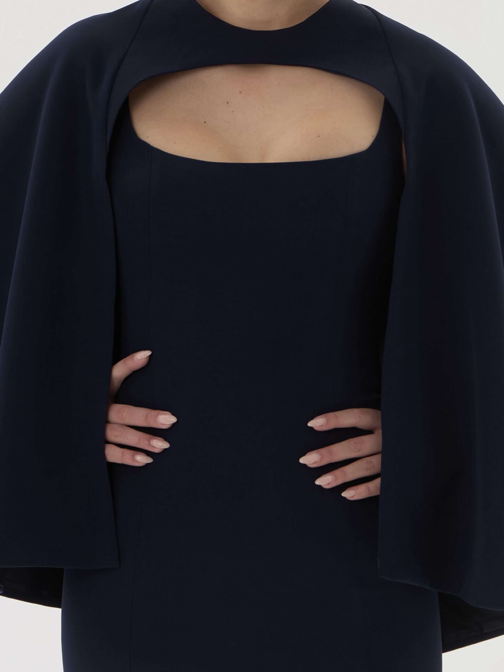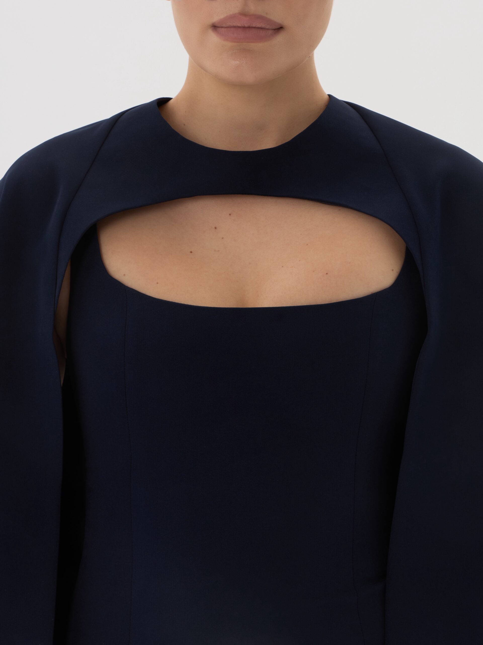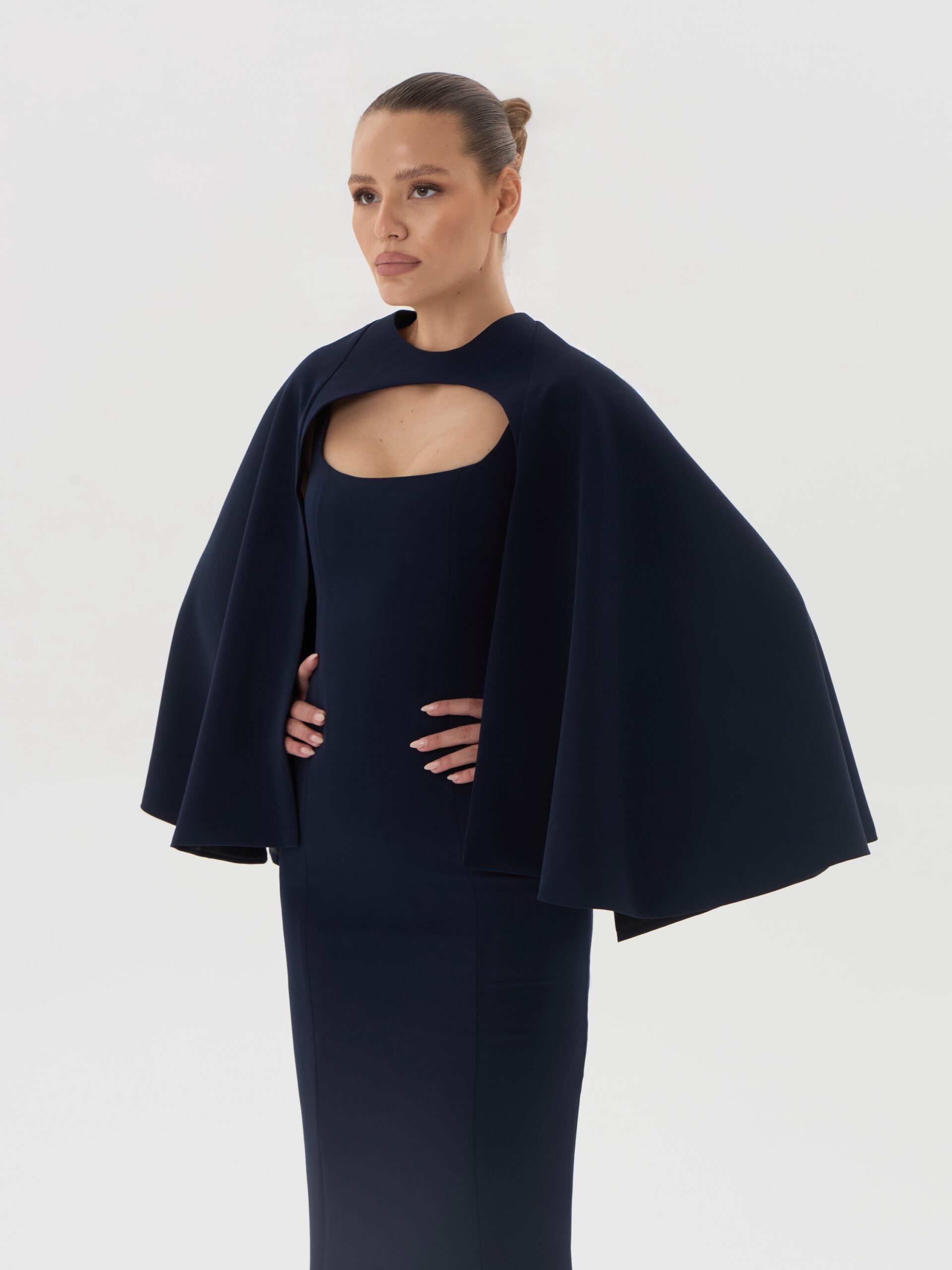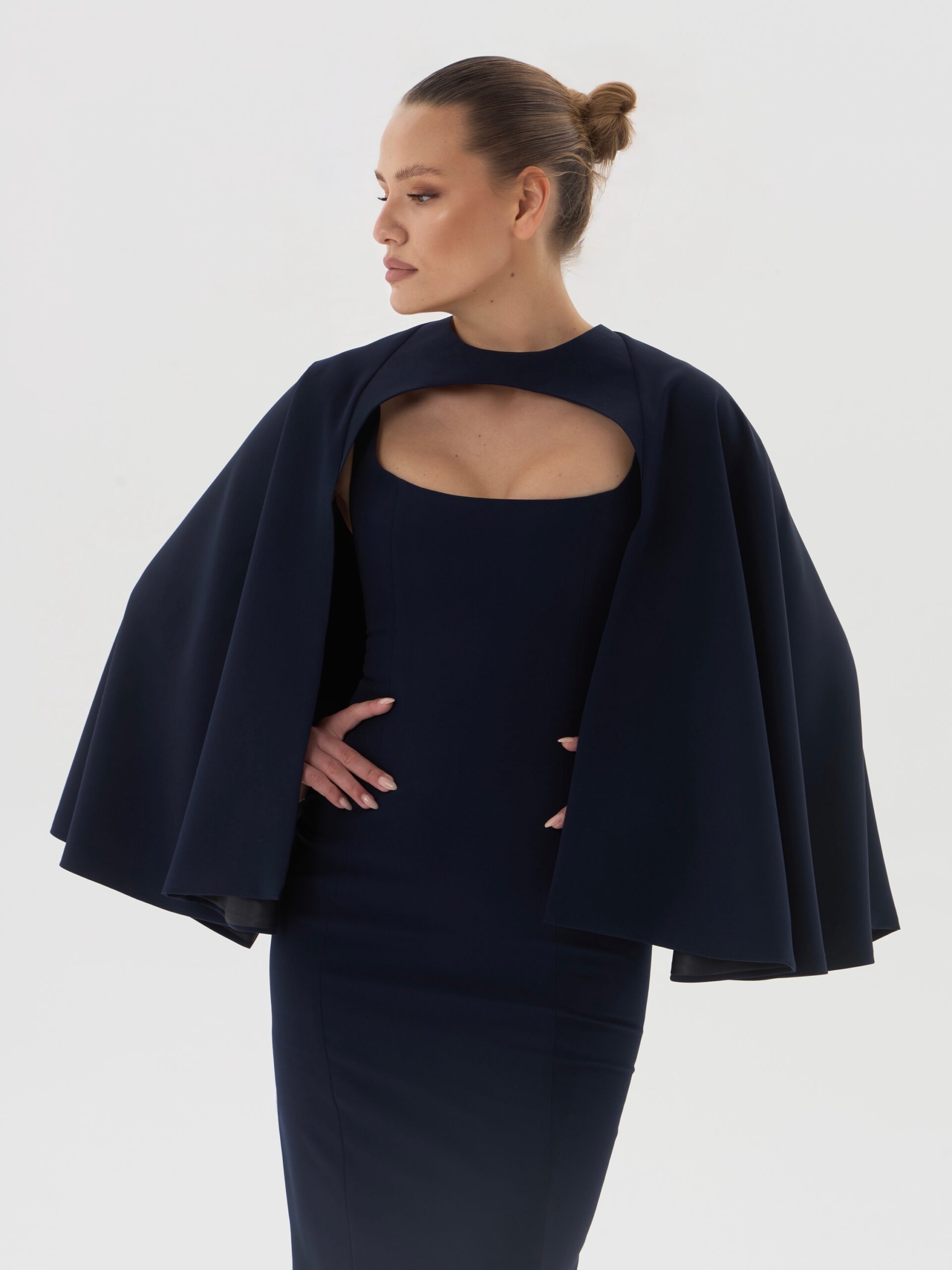 Приталенное платье миди с лаконичным вырезом и съёмной накидкой-кейпом, выполненное из плотной плательно-костюмной ткани глубокого королевского синего оттенка. Стрейчевая структура материала обеспечивает идеальную посадку и подчёркивает силуэт, формируя сдержанный и благородный вечерний образ с архитектурной линией плеч.