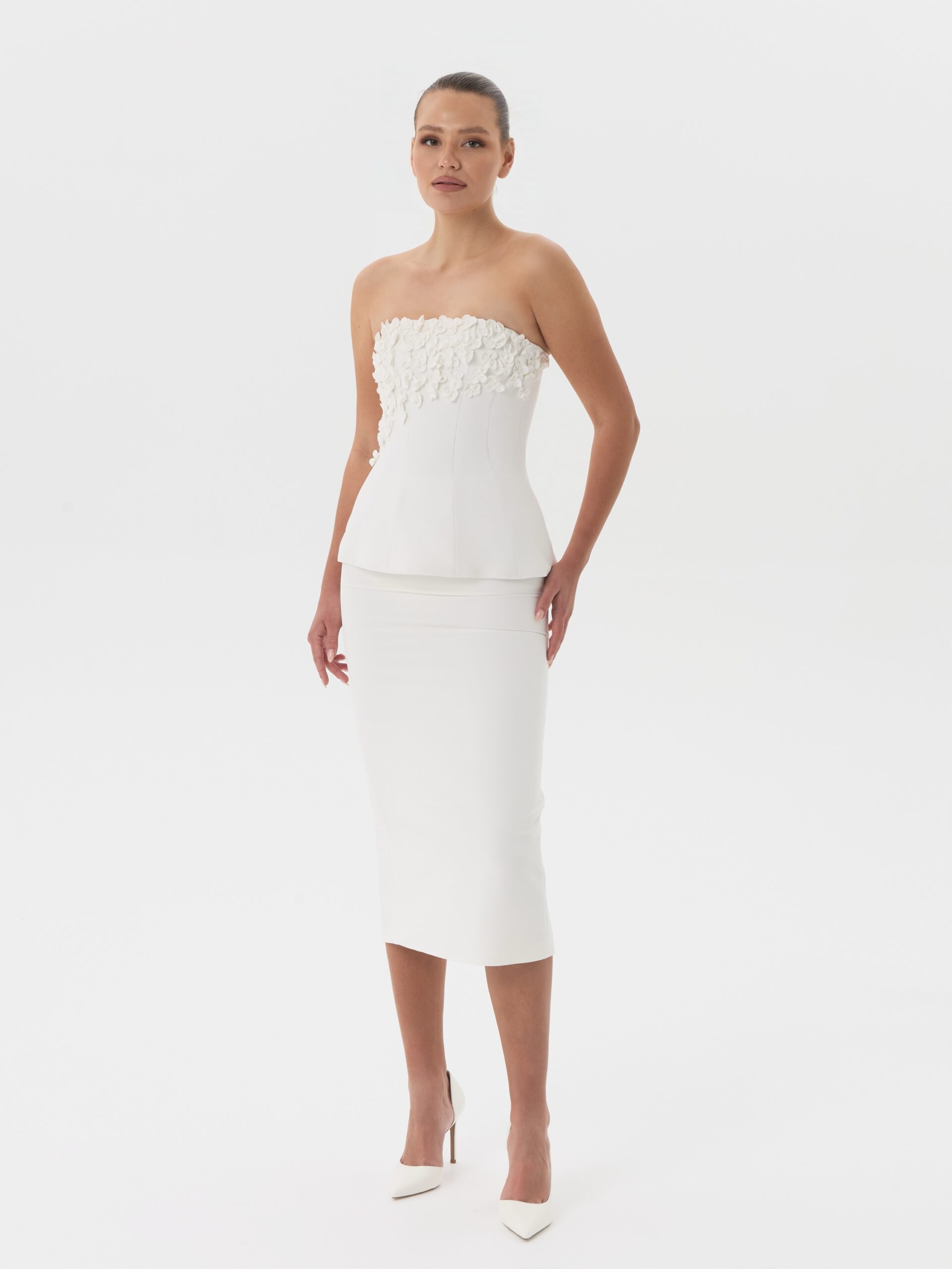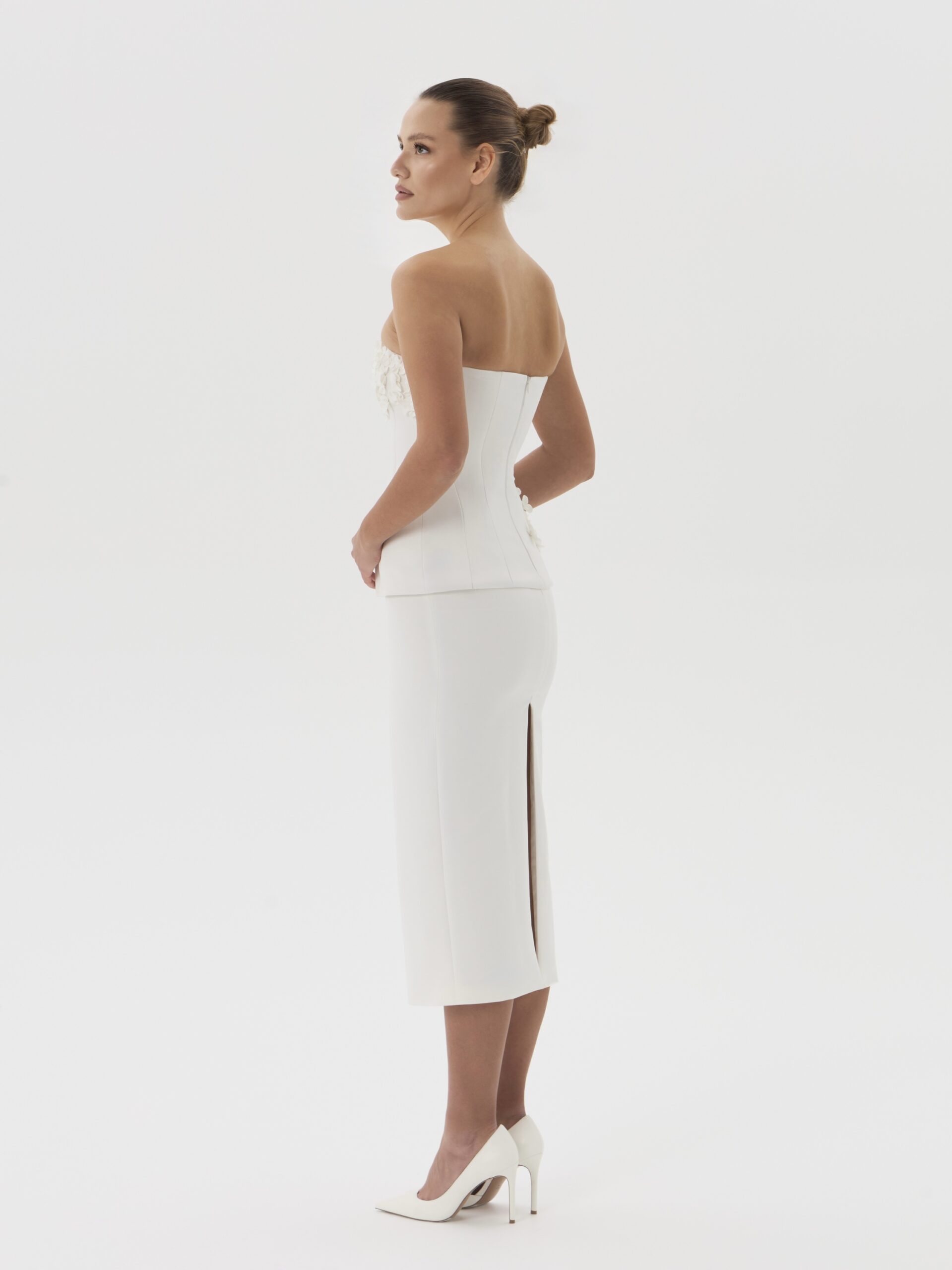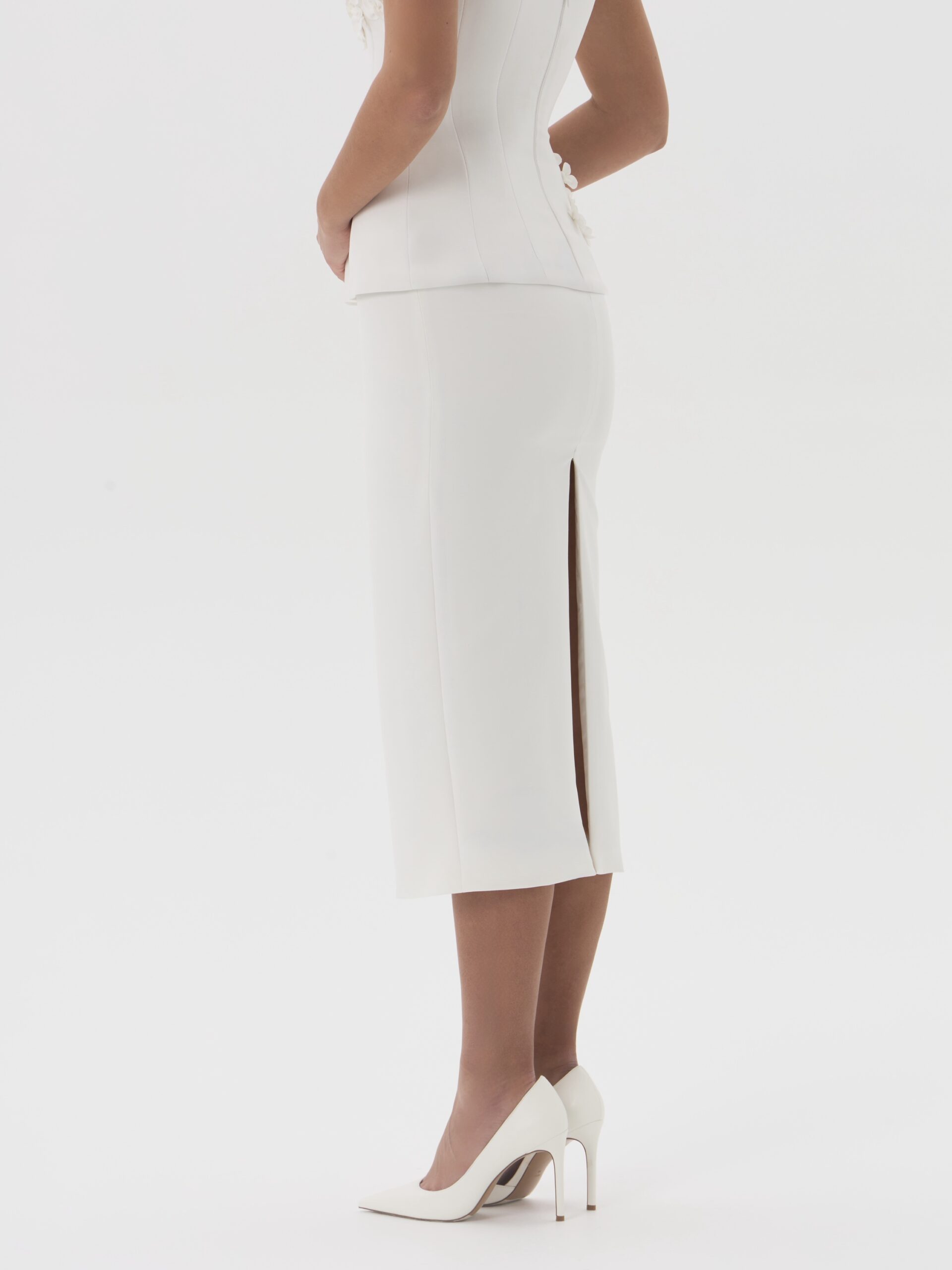 Юбка миди-карандаш с посадкой на бёдрах и разрезом сзади, выполненная из плотной плательно-костюмной ткани. Чистая линия силуэта подчёркивает фигуру и создаёт сдержанный, элегантный образ.
